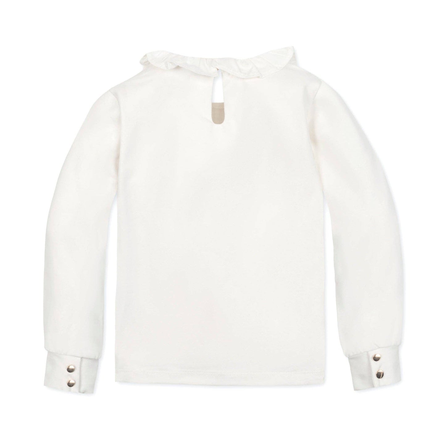 Our wear-with-anything knit top is the fall essential that pairs with everything. Features a woven ruffle neck collar and a knit bodice in soft organic cotton that has just the right amount of stretch. Gold buttons at the cuffs and a back keyhole neck closure add the finishing touch. Layers beautifully with our collection of organic cotton jumpers and sweaters.