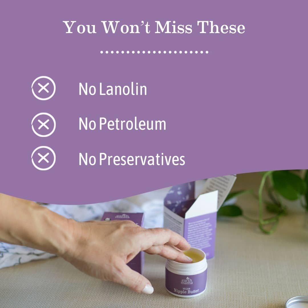 Meet your nipple superhero! Earth Mama Vegan Nipple Butter is a non-sticky, lanolin-free vegan nipple cream that’s Non-GMO Project Verified. This blend of organic calendula and cocoa butter traditionally used to soothe and moisturize dry skin works wonders on sore, cracked nipples and more. That means there’s no need to wash it off before nursing.